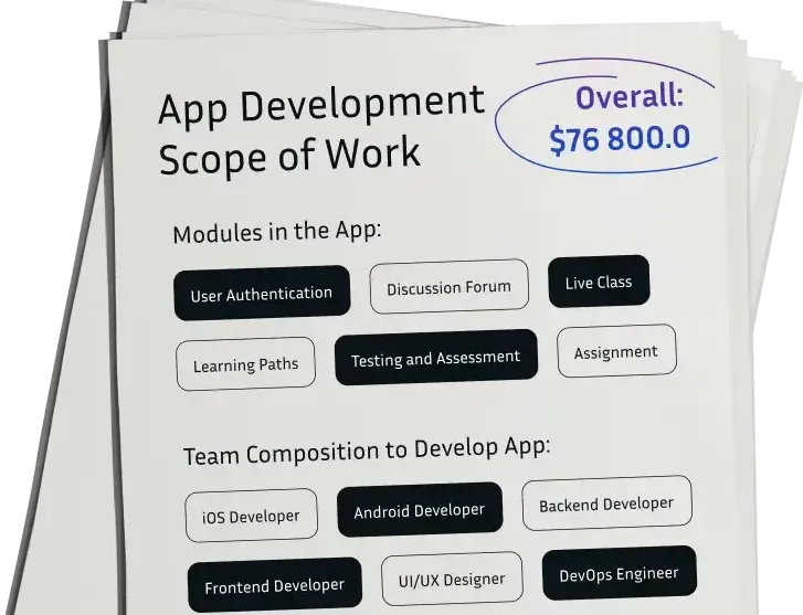 It provides a full feature breakdown and requirements for your Scope of Work, suggests the best tech stack (like Flutter or Node.js), maps out phased development and hiring needs, and splits costs and timelines by feature and development stage. You get a ready blueprint for your team or agency — not just a rough number.
